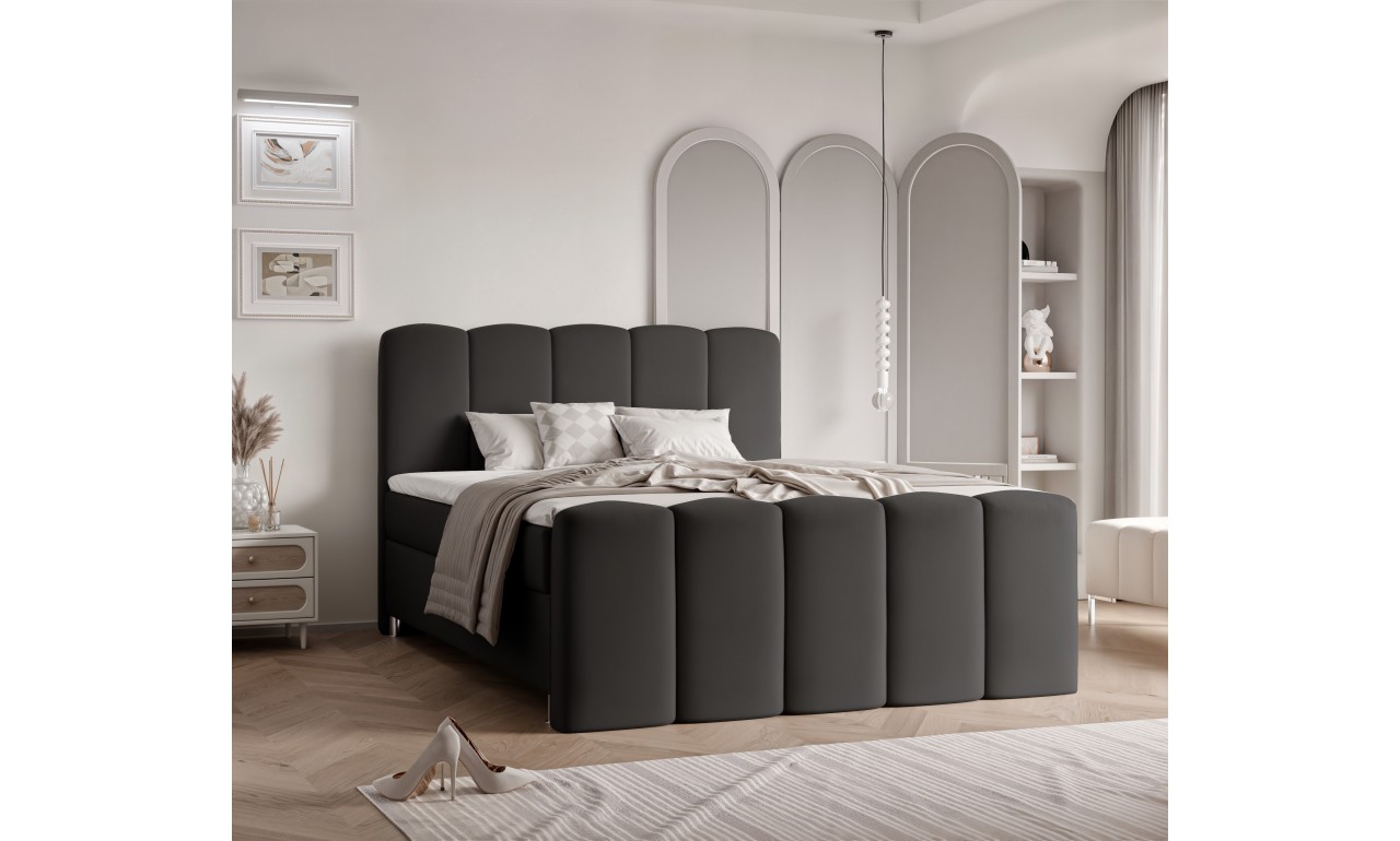 Łóżko kontynentalne VALENTINO to nowoczesna i stylowa propozycja dla osób ceniących komfort, jakość i estetykę. Model wyróżnia się zaokrąglonym zagłówkiem z pionowymi, tapicerowanymi panelami, które nadają mu wyjątkowego charakteru. Co więcej, efektowne panele tapicerowane znajdują się również z przodu i z tyłu łóżka, dzięki czemu prezentuje się ono doskonale i tworzy harmonijną, wyrafinowaną całość .