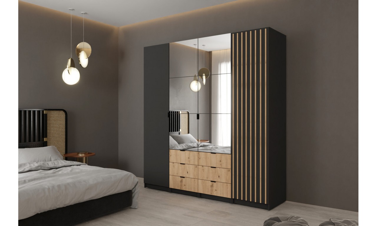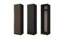 Moduły są wyposażone w pojemne szuflady, praktyczne półki lub przestrzeń z drążkiem, co pozwala stworzyć wnętrze szafy idealnie dopasowane do Twojego stylu przechowywania. Uchylne drzwi z czarnym uchwytem podkreślają nowoczesny, minimalistyczny charakter mebli.
