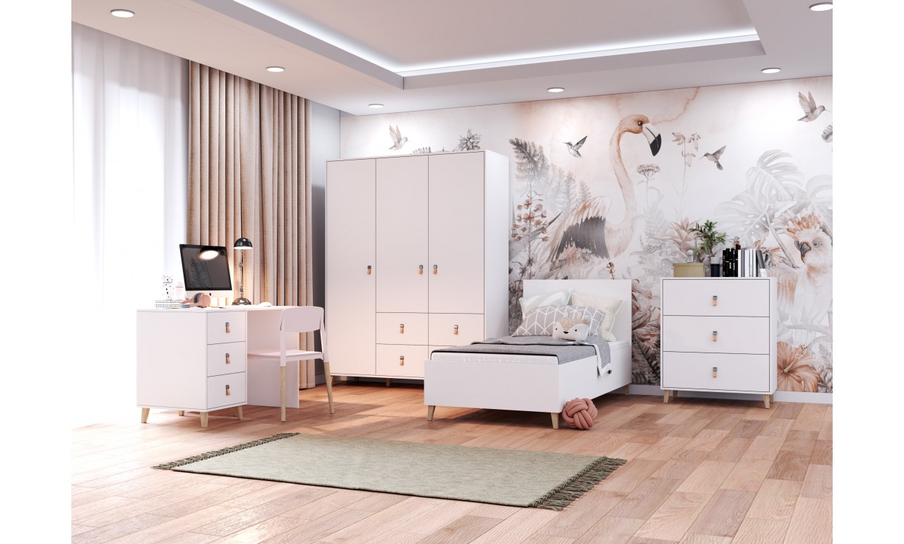 Łóżko Figo to esencja skandynawskiego designu, która łączy minimalistyczną formę z wyjątkową solidnością. Jasna kolorystyka mebla wsparta na eleganckich, drewnianych nogach nadaje wnętrzu lekkości i tworzy przytulną atmosferę, sprzyjającą odpoczynkowi w pokoju dziecięcym lub młodzieżowym.
