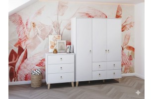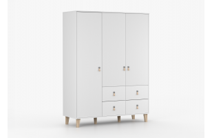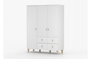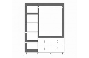 Szafa otwierana tradycyjnie o szerokości 150 cm. Wyposażona w 4 półki, 4 szuflady i 1 drążek. Osadzona na nóżkach.