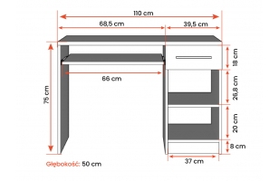 Przemyślana organizacja: Biurko oferuje nie tylko szeroki blat do pracy, ale także dedykowaną szufladę na klawiaturę, podręczną szufladę na przybory oraz pojemną szafkę z półką.