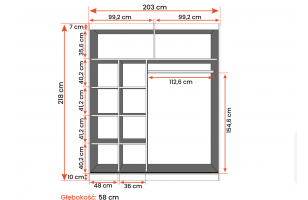 • Wymiary: szerokość 203 cm, wysokość 218 cm, głębokość 58 cm.