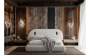 Designerskie Wezgłowie: Szerokie, owalne zagłowie (230 cm) wychodzi poza obrys ramy, tworząc efektowny panel ścienny. Taki zabieg optycznie powiększa sypialnię i nadaje jej szlachetnego charakteru.