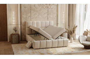 Luksusowe łóżko kontynentalne Victoria to połączenie wyrafinowanego designu z bezkompromisową wygodą. Masywna konstrukcja z wyrazistymi panelami  skrywa dwa pojemne schowki na pościel, a solidny materac bonellowy gwarantuje regenerujący sen każdej nocy. Spersonalizuj swój komfort dzięki wyborowi dodatkowego toppera oraz szerokiej palecie eleganckich tkanin, tworząc mebel idealnie dopasowany do Twojej sypialni.